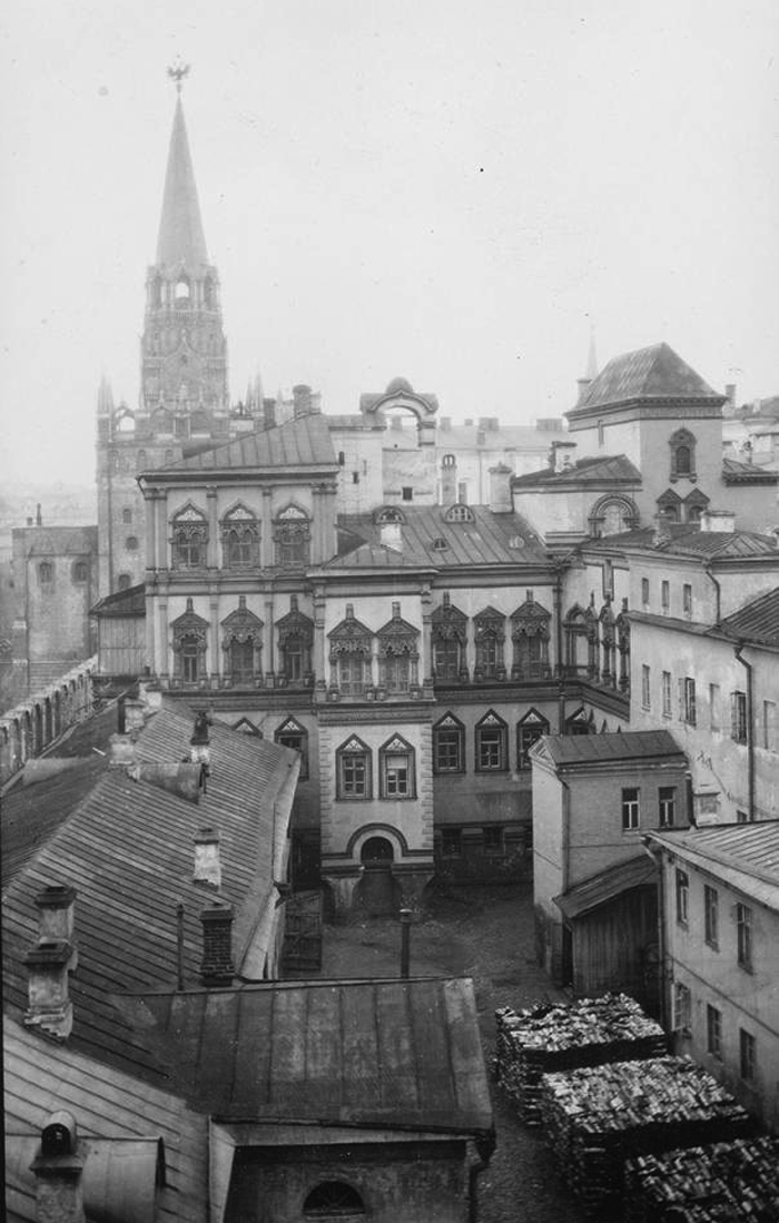 Это чрезвычайно важный источник, не фотография, а художественная работа. И вся правда о жизни здания в конце XIX века здесь видна без прикрас. Напомню, что это была канцелярия коменданта Москвы. Церкви с куполами здесь не видно, поскольку они были возрождены и воссозданы только в советские годы.
