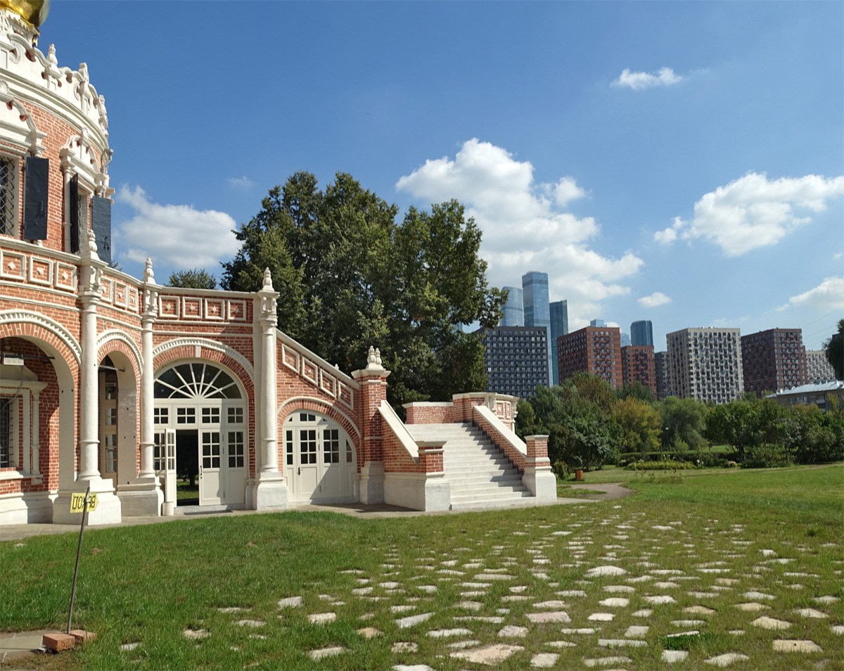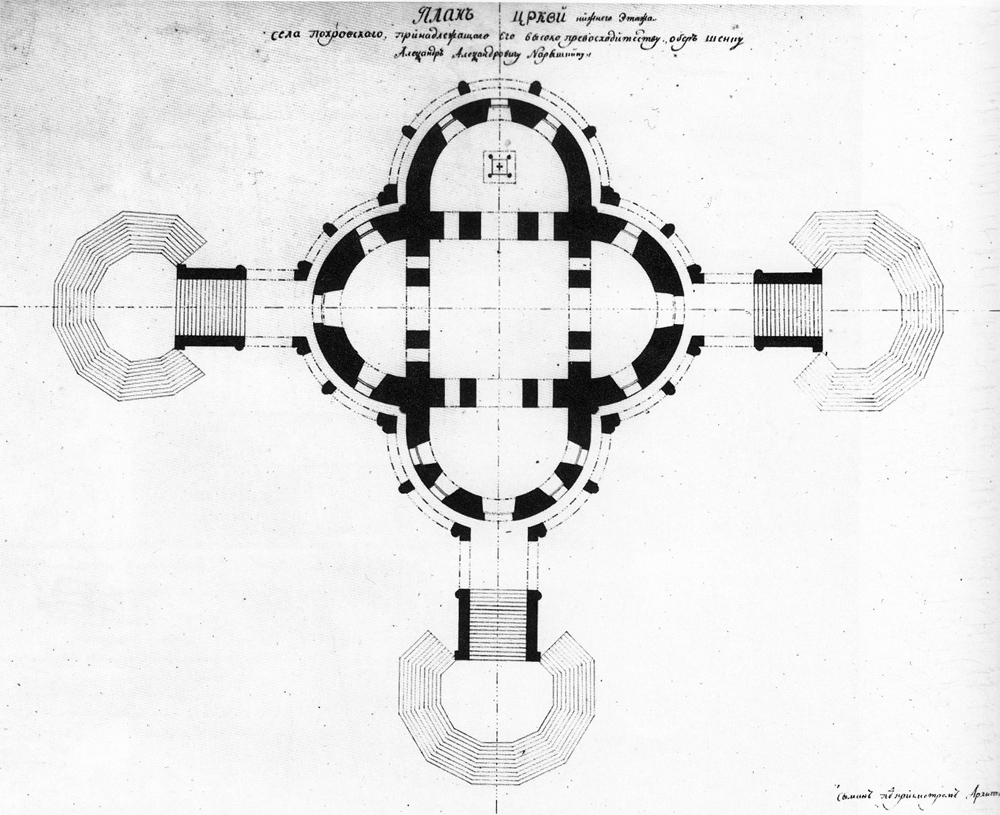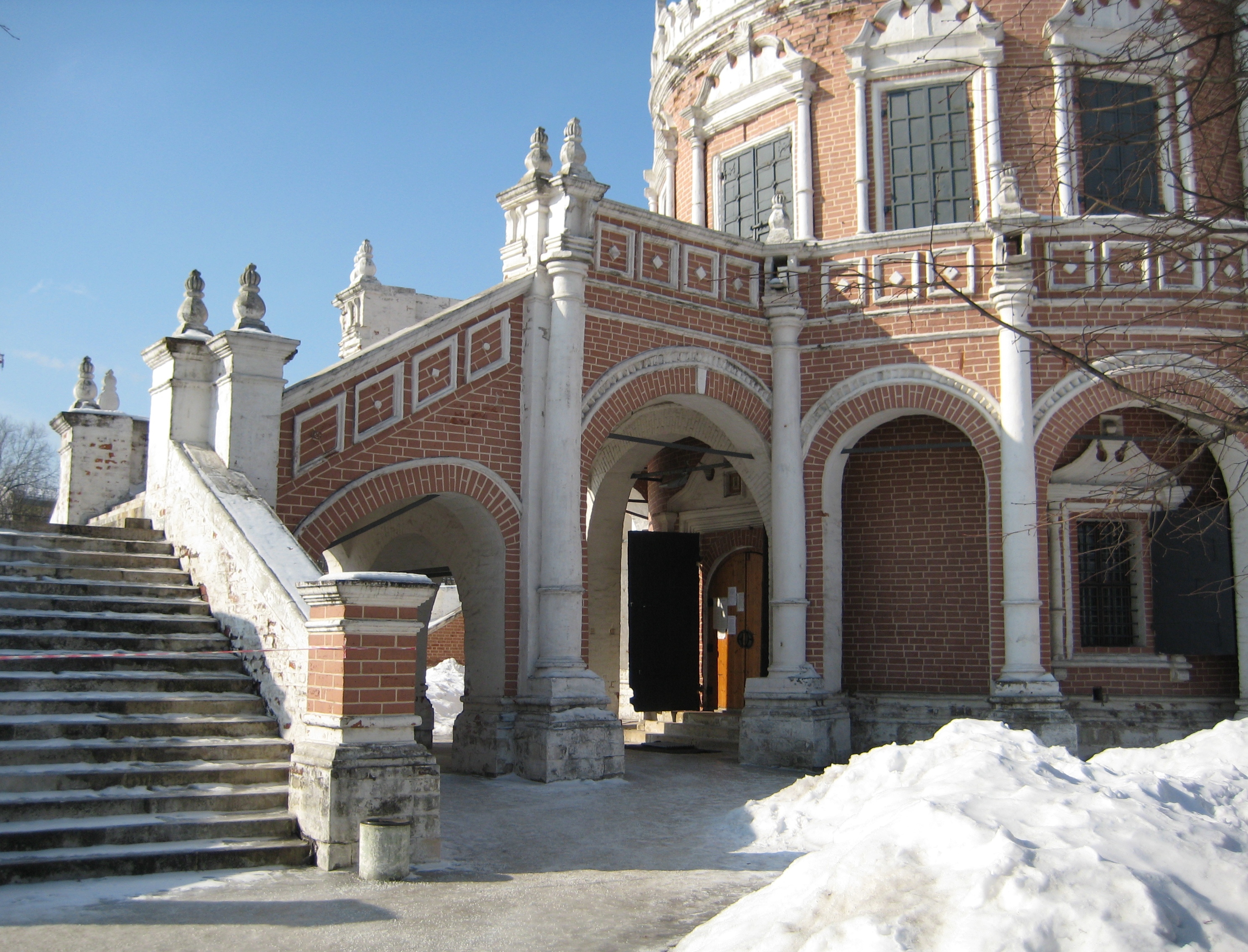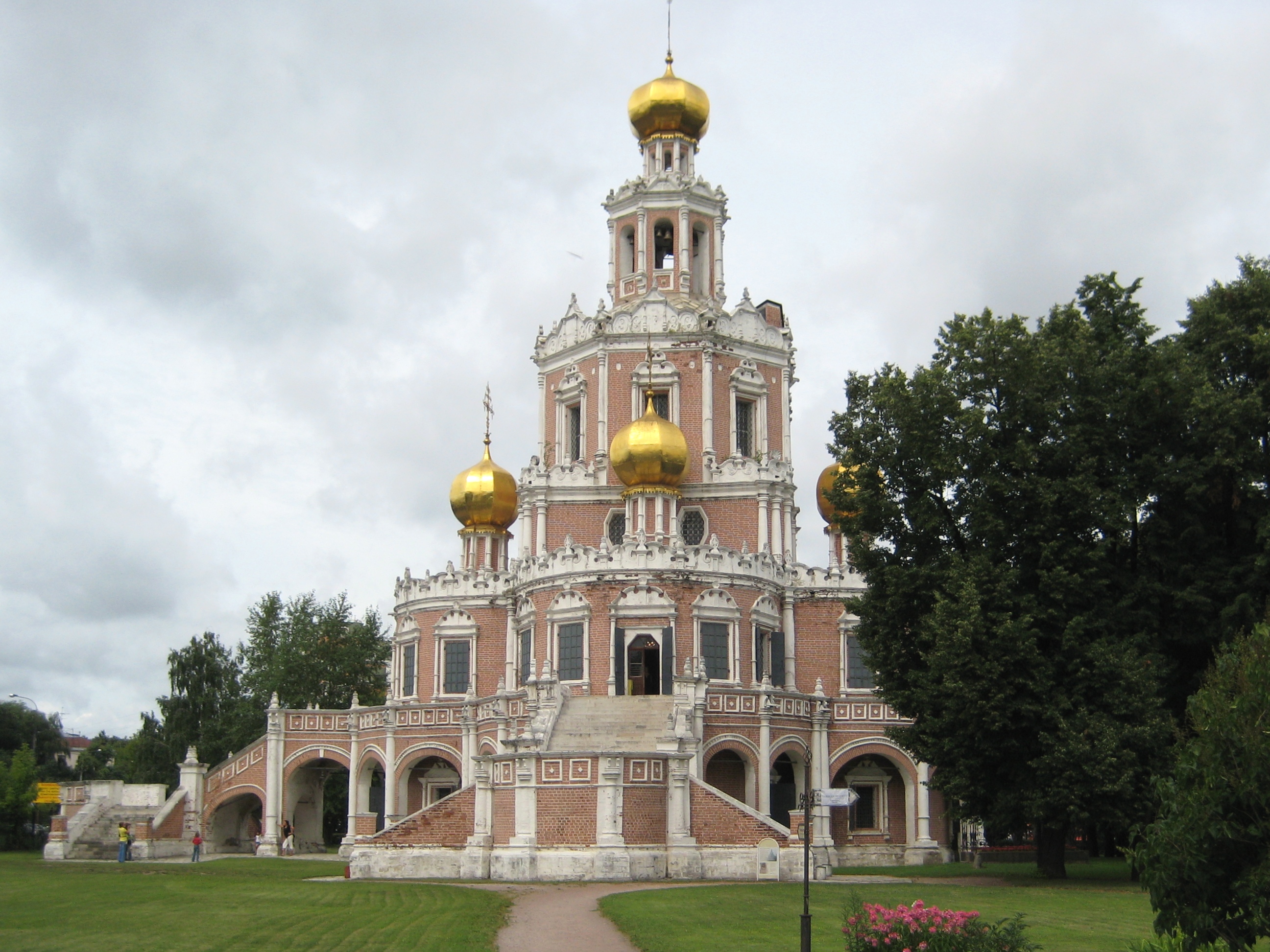 Храм Покрова в Филях – пятиярусная центрическая церковь, построенная в 1694 году в стиле «Нарышкинского» барокко. Здание церкви с четырехлепестковым планом двух нижних ярусов опоясано в уровне подклета аркадой гульбища. К нему с трех сторон ведут три широких открытых крыльца. Лишь отсутствие лестницы на галерею у восточного «лепестка» указывает местоположение алтаря.