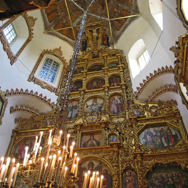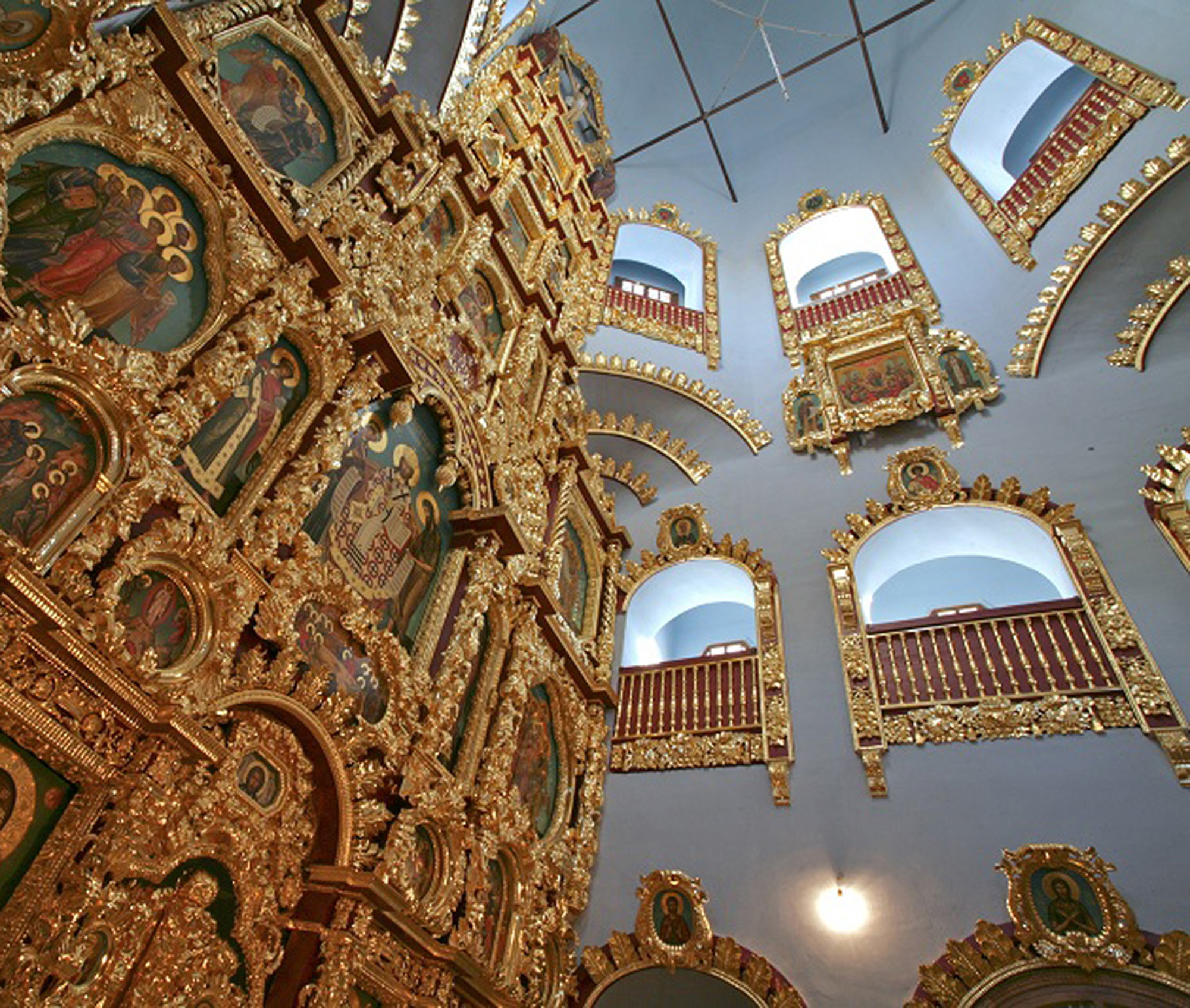 . Интерьер церкви. Слева возносится ввысь многоярусный иконостас,