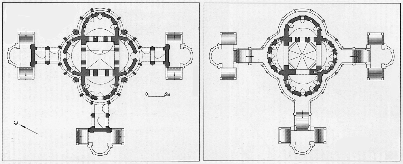 Все три церкви близки по высоте, по характеру построения объемов и по отделке деталей.