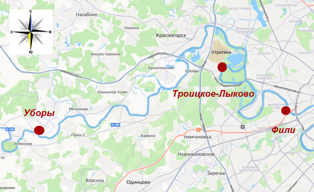 Схема размещения трех памятников архитектуры в верховьях Москва-реки