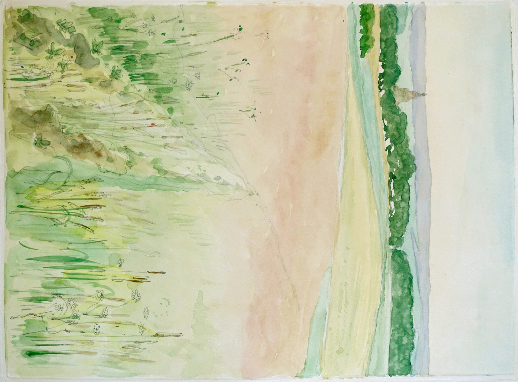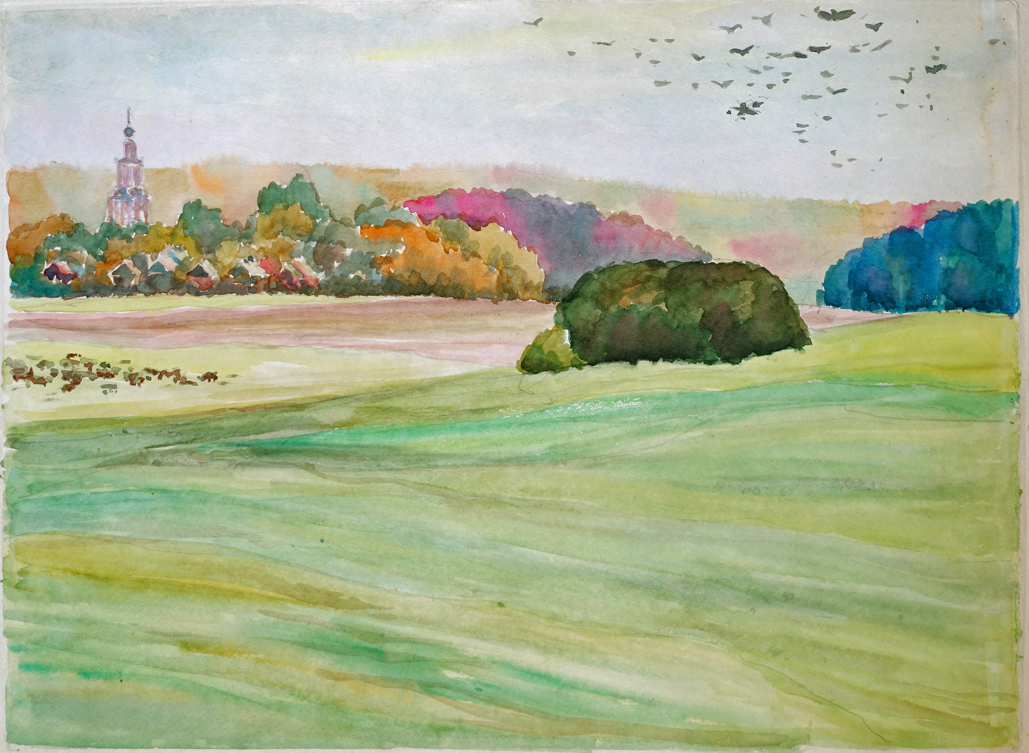 Летний пейзаж со стороны дороги. Медовый аромат трав. Бумага, акварель