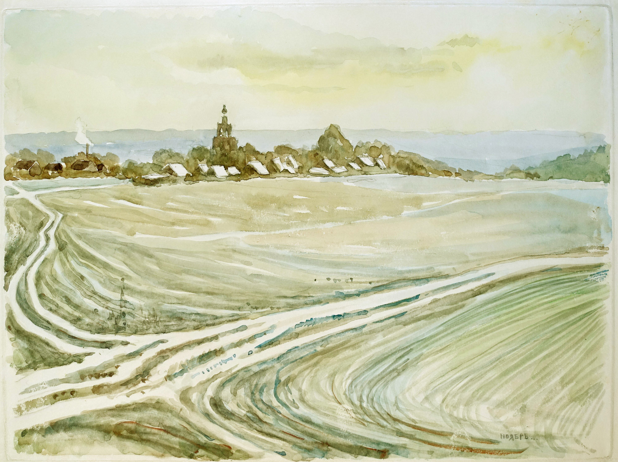 Зимний пейзаж. Заснеженные поля при въезде в село. Бумага, акварель
